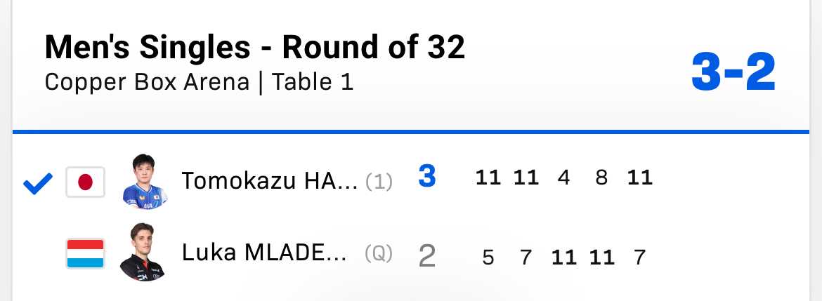 | 20:45 | T1 | 男子S-2回戦 | 張本智和WR4 3-2 ルカ・ムラデノビッチ(ルクセンブルク)WR87 美誠と同じようにフルゲームで負けてしまったらどうしようと心配したけど、異質のアンチラバー相手になんとか対応してきて勝てて良かった ![]() ![]() |