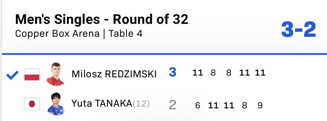 | 20:10 | T4 | 男子S-2回戦 | 田中佑汰WR37 2-3 ミウォシュ・レジムンスキ(ポーランド)WR46![]() |