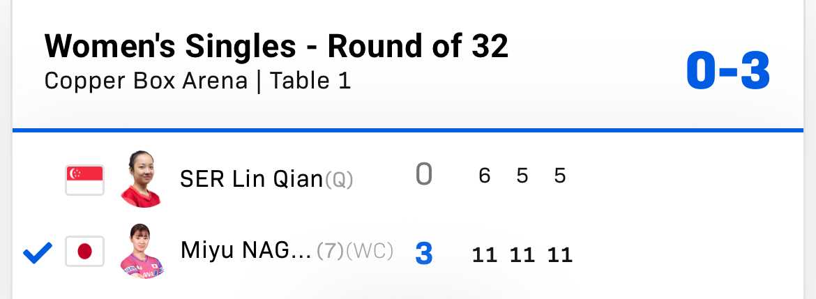 | 21:20 | T1 | 女子S-2回戦 | 長﨑美柚WR15 3-0 スー・リンチエン(シンガポール)WR165 余裕のストレート勝ちでしたね。 ![]() ![]() |