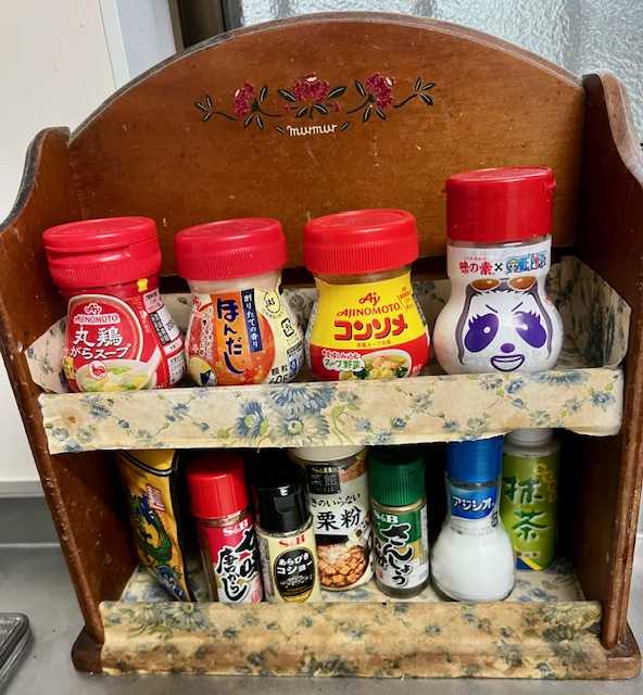 下段には、アジシオも。S&Bも多いなあw 棚の下が汚れてるけど、なかなか変えられないのです。
