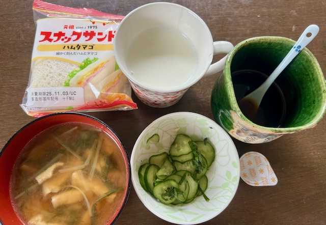 朝食(ブランチ)は、スナックサンド・ハムタマゴ、胡瓜・紫蘇、油揚げ・水菜の味噌汁、牛乳、コーヒー。