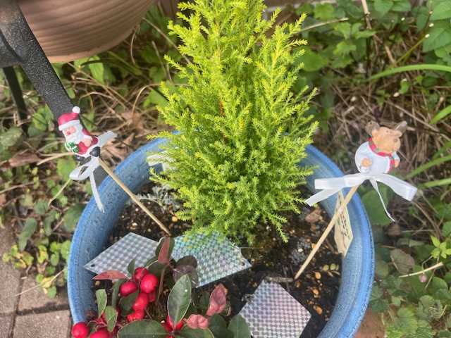帰宅後、さっそくゴールドクレストとチェッカーベリーの鉢に挿しました。