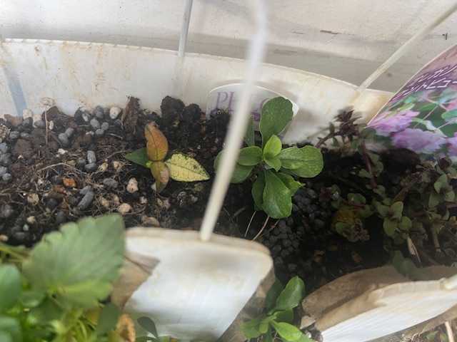 左下に、ルリマツリモドキ・ブルーサファイアを挿し芽。右下にはサルビア・アズレア。根付くかな?