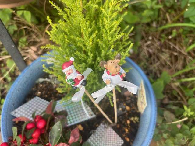 今日、イオンの花屋で買ったサンタとトナカイのガーデンピック。顔をよく見て、選んでみましたw
