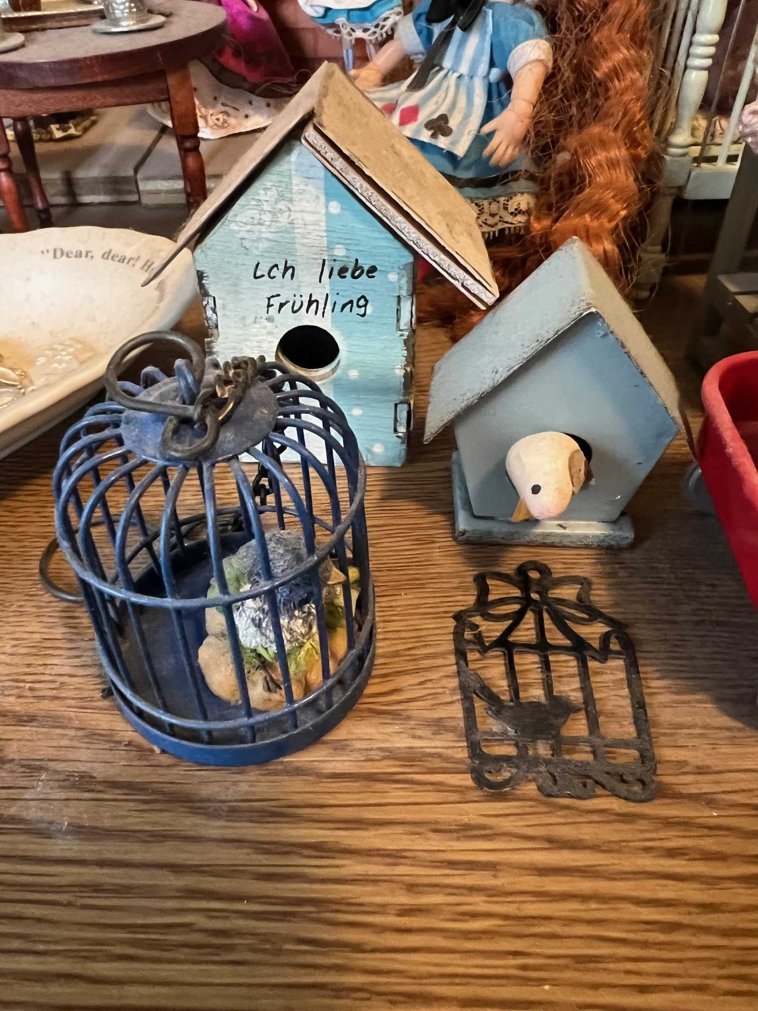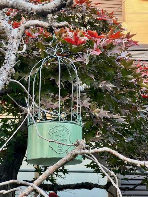 巣箱や鳥かごを、枯れたハナミズキに掛けたり、