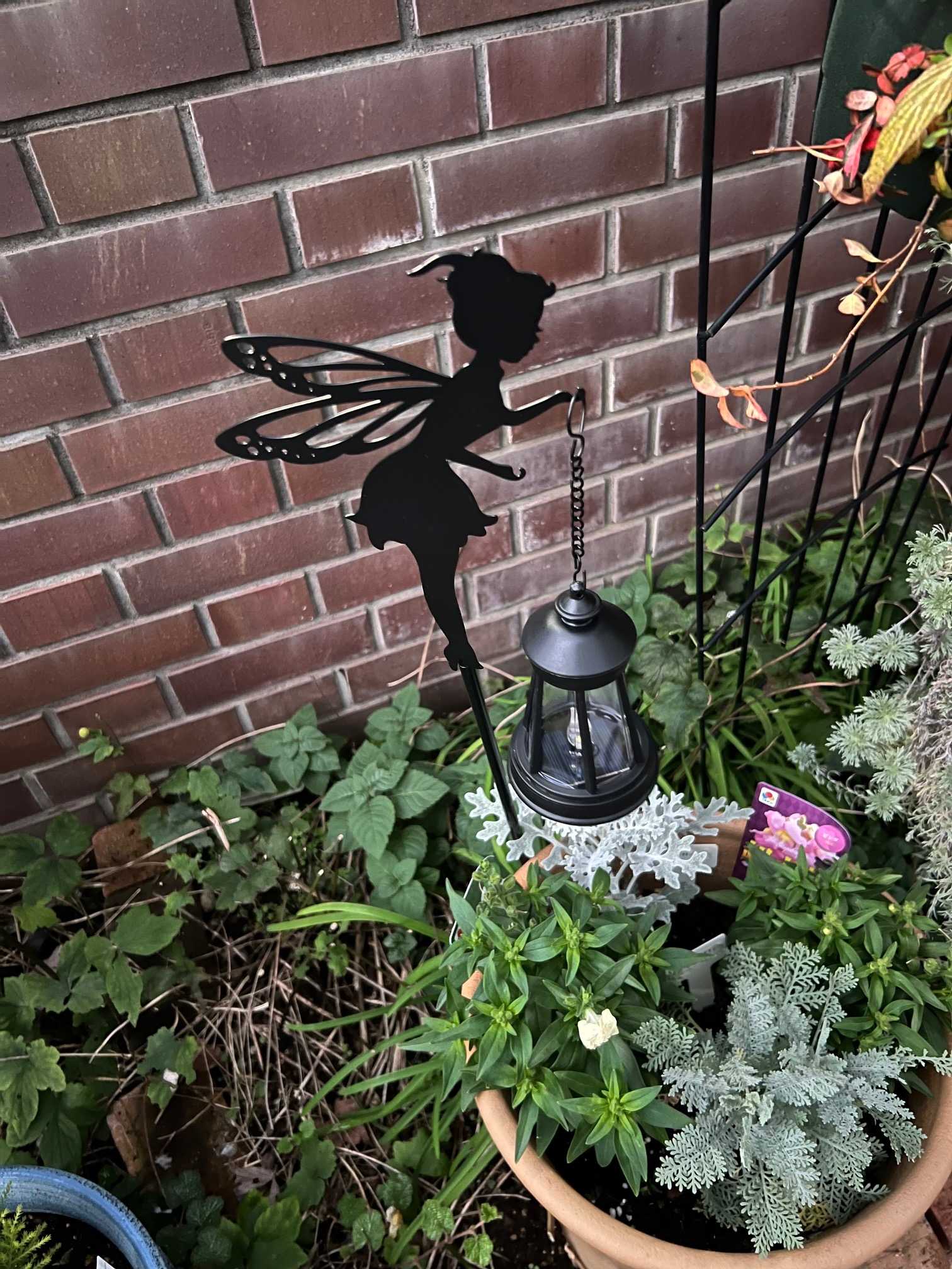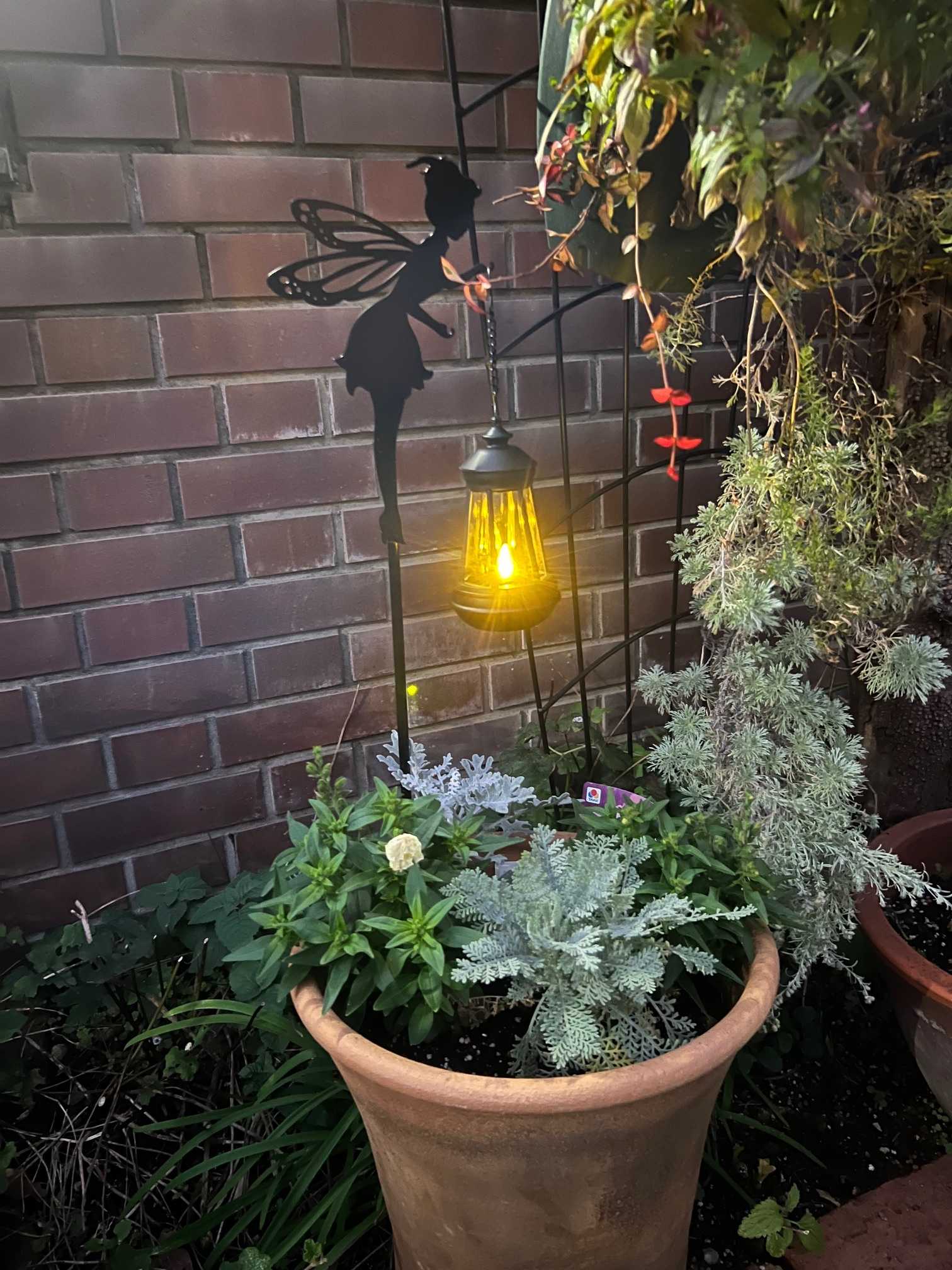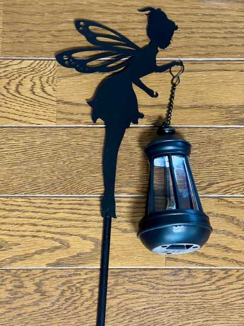 ティンカーベルのソーラーライトをハナミズキの下の花壇に挿したりしてみました。