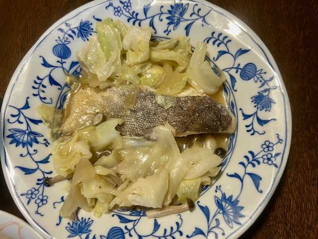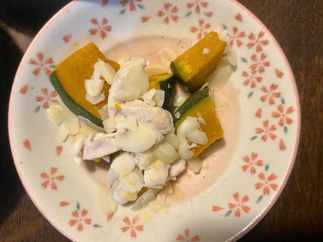夕食は、昨夜の夕食の残りの、真だらのアクアパッツア(真だら・キャベツ・ミニトマト・アンチョビ&ガーリックソース・塩胡椒・オリーブオイル)、チキンのパンプキンサラダ・スライスアーモンド。