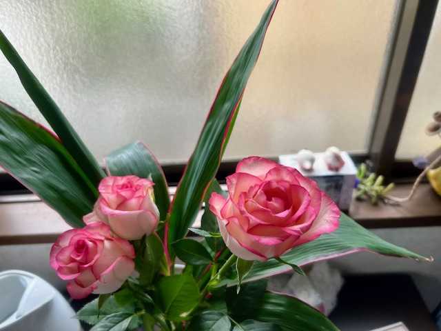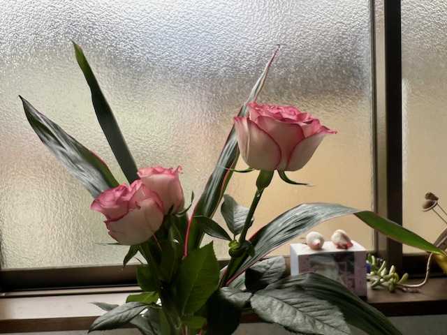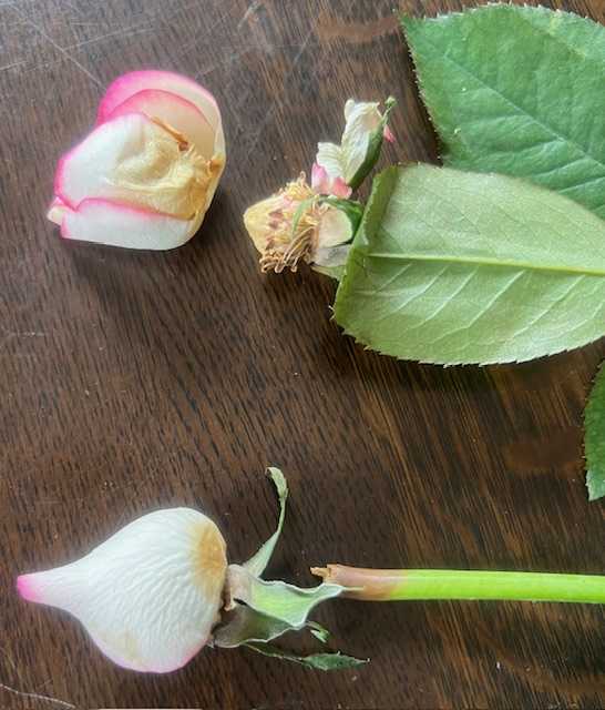 先日買ったバラの蕾が枯れてきてると思ったら、2本とも、首が腐って折れてしまいました・・・