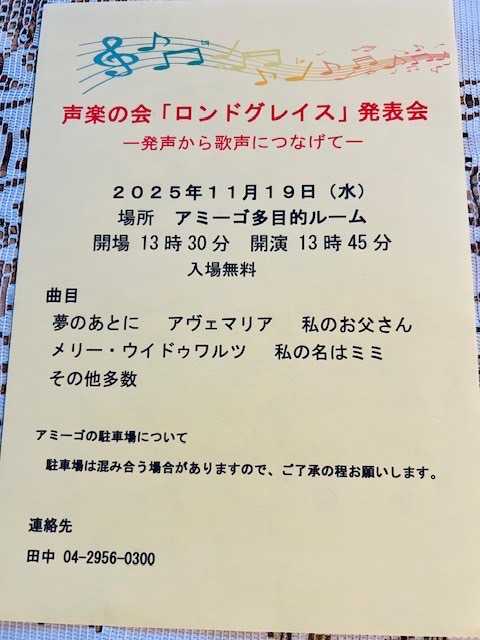 2025年11月12日XML 11/19の声楽発表会のリハーサルでした。曲目は「アベマリア」( Luigi Luzzi ) 「霧と話した」(中田喜直作曲) ミュージカル「レ・ミゼラブル」の「夢やぶれて」 アリア「私は卑しいしもべIo son l'umile ancella」(オペラ『アドリアーナ・ルクヴルール』第1幕から)