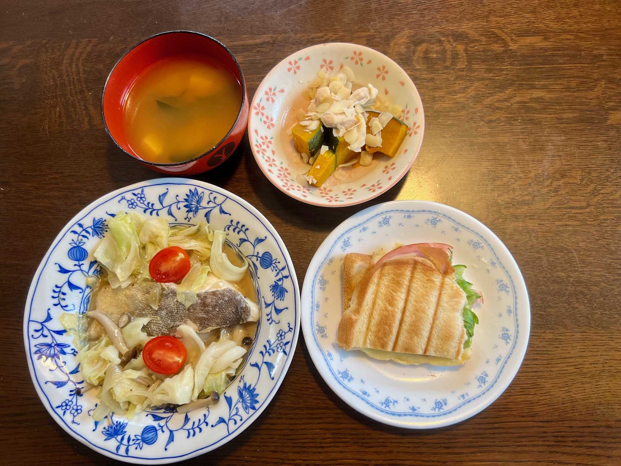 昼食は、朝食のホットサンドの残りと、 昨夜の夕食の残りの真だらのアクアパッツア(真だら・キャベツ・ミニトマト・アンチョビ&ガーリックソース・塩胡椒・オリーブオイル)、チキンのパンプキンサラダ・スライスアーモンド。 朝食分だけ、昼食に食べ、 他はまた今夜の夕食へ。食欲無くて、押せ押せだなあw
