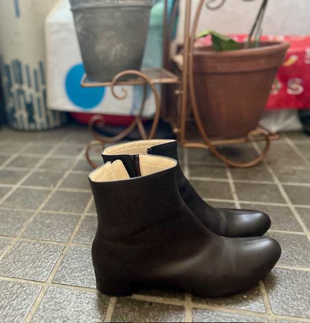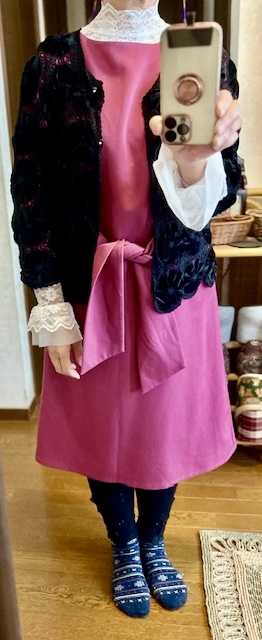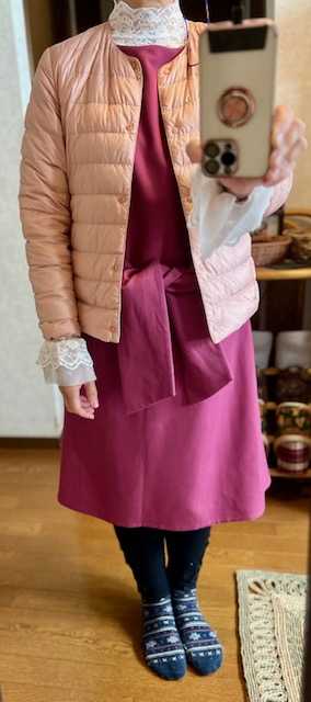 白レースインナー、マゼンタのワンピース、黒スパッツ、紺・ベージュなどの靴下、茶のショートブーツ。