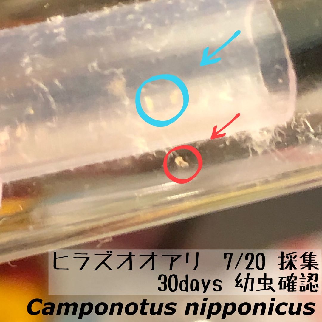 2020 7/20〜22採集もの ・ヒラズオオアリ A Q1 産卵 B Q1 産卵 →幼虫らしきものあり →死亡 C Q1 未産卵 →綿にカビ ・ヒラズオオアリ Q1+3 卵 現3匹 居心地が悪そうなので小コルク巣に変更 8/9 有翅メス(ピンク)3匹追加 →あちこちに分かれている →8/28給餌 よく食べた 卵有 無印3+ピンク1 試験管ではなく、小コルク巣のコルクじゃない部分に集まっている ・オオアリ sp. 8mm ウメマツ?より大? → 蛹あり ・オオアリ sp. →幼虫有 →蛹あり ・オオアリ sp. cf. ウメマツオオアリ 7〜8mm Q1(寝室) Q2+3〜4 試験管連結巣で多頭 結構産卵してる→結構うろうろしている。給餌してやろうか悩み中 ・オオアリsp. cf. ウメマツオオアリ 8mm程度 ※大きめのものを◎とします A Q1 未産卵 →未産卵 F Q1 卵 →幼虫卵 →蛹有 G Q1+1 卵 →蛹有? B Q1 ◎ 卵 →蛹有 C Q1 ◎ 卵 →蛹有 D Q1 ◎ 卵 →蛹有 E Q1 ◎ 卵 →蛹有 I Q1+6 卵多 →卵無し 雌2まで減→死亡 J Q1+2 卵多 分割を検討 →分割 なんかいまいち K Q2+4 卵多 →分割 コルク平 コルクに蛹1有 有翅3のみ (マーキング失敗) →→JK統合ミニコルク巣 マーキング失敗により無翅女王なし →独立させたKが産卵してた cf.トビイロシワアリ H Q1+3 腹部が丸っこいやつら 卵多 赤 8/8 卵のまま 現在雌2〜3 →雌2 卵あるが状態は悪い ・ケアリ sp. 茶色 cf.トビイロケアリ D Q1+2 卵多 →マーカー赤単独 蛹多 →ワーカー1 E Q1+6 女王白 有翅黄 →蛹多 →ワーカー5〜6 ・ケアリ? sp. 黒い 卵多 →蛹多 →ワーカー3 ワーカーがどんどんでてるから、石膏巣とかよいなあな ・クサオオアリ? Q1+1 多分未産卵 コルク加湿に変更→更に改良版の小コルク巣に移動→一匹死亡。残りは有翅1 番外編バルバルス どんどん羽化してる