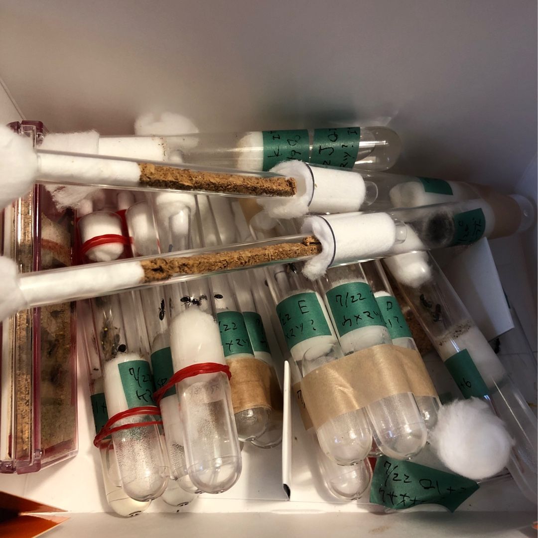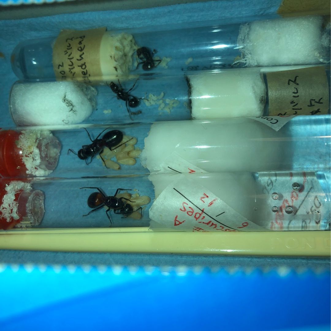 2020 7/20〜22採集もの ・ヒラズオオアリ 新女王 三匹 6〜7mm ほっそりしていて胸部が褐色 よくのぼる A Q1 産卵 B Q1 産卵 →幼虫らしきものあり C Q1 未産卵 →綿にカビ ・ヒラズオオアリ Q1+3 卵 現3匹 居心地が悪そうなので小コルク巣に変更 8/9 有翅メス(ピンク)3匹追加 →あちこちに分かれている。変化なし ・オオアリ sp. 8mm ウメマツ?より大? → 蛹あり ・オオアリ sp. cf. ウメマツオオアリ 7〜8mm Q1(寝室) Q2+3〜4 試験管連結巣で多頭 結構産卵してる ・オオアリsp. cf. ウメマツオオアリ 8mm程度 ※大きめのものを◎とします A Q1 未産卵 →未産卵 F Q1 卵 →幼虫卵 G Q1+1 卵 →蛹有? B Q1 ◎ 卵 →蛹有 C Q1 ◎ 卵 →蛹有 D Q1 ◎ 卵 →蛹有 E Q1 ◎ 卵 →蛹有 I Q1+6 卵多 →卵無し 雌2まで減 J Q1+2 卵多 分割を検討 →分割 なんかいまいち K Q2+4 卵多 →分割 コルク平 コルクに蛹1有 cf.トビイロシワアリ H Q1+3 腹部が丸っこいやつら 卵多 赤 8/8 卵のまま 現在雌2〜3 ・ケアリ sp. 茶色 cf.トビイロケアリ D Q1+2 卵多 →マーカー赤単独 蛹多 E Q1+6 女王白 有翅黄 →蛹多 ・オオアリ sp. →幼虫有 ・ケアリ? sp. 黒い 卵多 →蛹多 ・クサオオアリ? Q1+1 多分未産卵 コルク加湿に変更→更に改良版の小コルク巣に移動 8/12 採集 ヒラズオオアリ (コルクに産卵されたらわからない α 脱翅女王×1 ミニコルク巣 →所在不明。多分コルクの隙間 β 脱翅女王×1 ミニコルク巣 →コルクにいる。すごくはさまってる γ 脱翅女王×1 + 有翅雌×4 ミニコルク巣 →脱翅3有翅1コルク内に集まる δ 有翅雌×3 + 雄×2 ミニコルク巣 雄死亡 → 未脱翅2 卵無 ε 有翅雌×2 + 雄×2 ミニコルク巣 雄死亡 →脱翅1 試験管内に卵1 クサオオアリ? 有翅雌×2 ミニ加湿コルク巣 →未産卵翅有 ウメマツオオアリ系 有翅雌×2 ミニコルク巣 →未産卵翅有 ケアリ系(茶) F 脱翅女王×1 + 有翅雌×2 試験管 →卵有