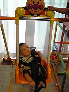 長男はAくんちに行くとおおはりきり。仕方がないので、次男を連れて行き、遊び部屋にあるブランコに乗せてみたら、案外座っていられました。