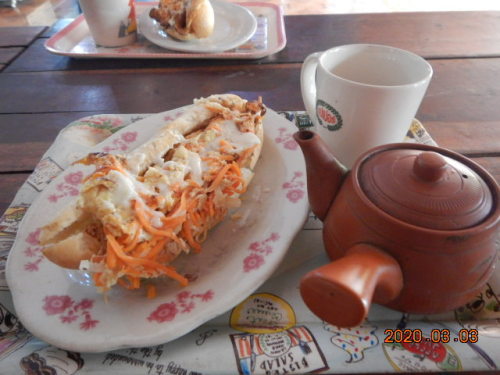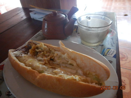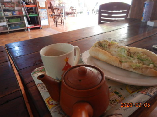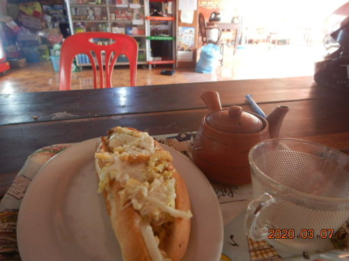 TAKEO Guest House 2泊目 @1,100円 303号室住所:National Rord 6 #258 Ta Phul Village Sangkat Svay Dangkom,Phumi Ta Phul Siem Reap W 柄シーツ、窓あり、天井扇風機、10W×2、机、洋トイレと湯シャワー、朝食付き(フランスパンのサンドイッチ、紅茶)7時に起床した。部屋は蚊が多いので蚊帳を吊って寝たので刺されなかったが、起きてから刺されて、潰すと血をたっぷりと吸っていた。宿は朝食付きだ。30分ほど待たされて、朝食が出てきた。フランスパンに人参シリシリが挟んであった。見た目は雑な作り。紅茶は急須に入っているので、量があるのでうれしい。午前中は動画編集作業を行う。部屋が薄暗いので目に悪い。1本編集を終えて昼食へ出かけた。11時半歩き出す。それほど暑くはない。少し街の様子を偵察する。パン屋の店内をみた。エアコンが効いている。コーヒーがの飲めてケーキが食べられる席がある。上着が必要な涼しさ。貸し自転車屋があった。カンボジアの自転車は中々性能がいい。大衆飯屋を発見した。野菜煮つけ、ナマズ汁、ご飯で330円とお手頃価格だ。清潔度はない。味はマアマアだが砂糖使い過ぎ。薬局に寄った。マスクを販売していた。箱入りもある。小分けで10枚セットで550円と高いが、入手できるのだから購入しておく。やはりカンボジアは何でもありの国だ。帰路、スーパーでアンパン1個83円、コーラ500ml入り55円、飲料水1.5リットル55円購入。宿に帰り。動画をユーチューブにアップロードした。あとは2階にあるベランダで読書をする。沈黙の艦隊が揃っていたので、マラッカの宿で読めなかった巻を読んでみた?内容が違うのだ。おかしい!ネットで検索してみるとマラッカの宿で呼んだのは、『ジパング』で、かわぐちかいじ著だったのだ。作者同じで勘違いしていた。15時部屋に戻り。電熱コイルで湯を沸かしインスタントコーヒー淹れる。先ほど買ったアンパンとおやつにした。ベランダから見ていると屋台のサンドイッチ屋が営業していた。夕方に出現するバイクサイドカー屋台だ。読書を止めて、サンドイッチを買いに出かけた。1本55円×2本購入した。行きつけの雑貨屋に腰かけて、ビールを飲みながら楽しんだ。一時の幸せを感じる。