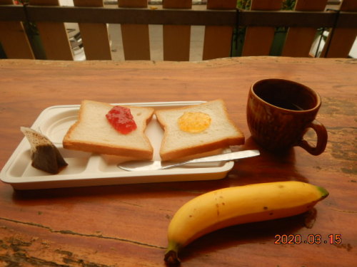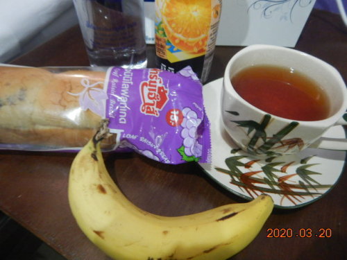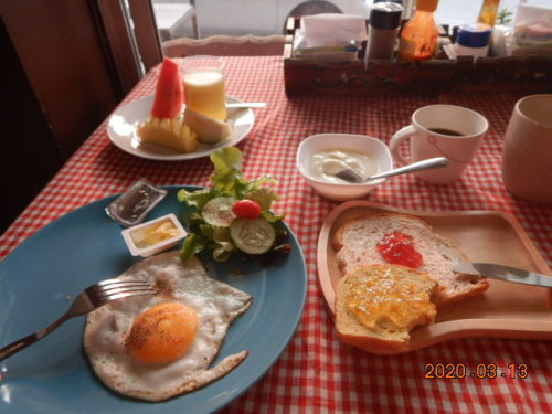Jonsom House @1,260円 302号室住所:897/2 Jedyod Rd. Wiang Muang Chiang Rai Thailand 57000W 白シーツ、毛布、バスタオル×2、飲料水×2本、窓あり、A/C、TV、冷蔵庫、20W丸蛍光灯、机、椅子、クローゼット、洋トイレと湯シャワー、朝食付き7時半朝食の時間だ。この宿を予約したのは、焼き立てのパンとコーヒーが美味しいとの書き込みをみたからだ。朝食は大いに期待していた。しかし朝からコーヒーを飲むと下痢してしまう。本館の一階へ行く、裏のプレハブ部屋に追いやられたのは気にくわない。先ずはコーヒーを飲みなさいと言う事だ。飲み物はコーヒーしか用意されていない。パンは4種類スライスされていた。自分でトーストして食べるのだ。ヨーグルトが運ばれてきた。焼いたパンに2種類のジャム(苺とママレード)を塗り食べた。コーヒーは苦い。このままでは胃が焼けるので水を飲む。パンは普通すぎて評価はできない。大きめの皿に生野菜(レタス、キュウリ、ミニトマト半分)小さなクロワッサン、バター冷えた目玉焼きが載っていた。最後に生ジュース(危険がいっぱい)スイカ、パイン、グアバの小切れ)の朝食だった。全てを食べ終えないうちに腹がゴロゴロいいだした。慌ててパンを口に詰め込み、部屋に帰りトイレに駆け込んだ。危機一髪、下痢便だ。12時チェックアウトだ。それまでウダウダと過ごした。昨日動画編集作業を行ったので眠い。11時にパッキングを始めて30分後にチェックアウトした。徒歩2分の距離に昨日見つけておいた宿がある。予約はしていないが、空き部屋はあるだろう。4日分の宿泊料金と鍵預り金720円を払い。チェックインを済ませた。3階でエレベーター無し。階段で上るが問題なしだ。部屋は3階なので見晴らしがいい。冷蔵庫があるのがうれしい。問題のWIFIはバッチリと繋がった。胃の具合が悪い。2度目のトイレに行く、私にはあの朝食はダメだった。市場をグーグル地図検索する。約800mの距離にある。果物を買いに出かける。途中のロータリーで3番出口へ進むの案内が理解できずに、少しだけ迷うが、市場に到着できた。かなり大きい。バナナを探すが、鮮度が良く太めが見つからない。アボガド、ミカン、マンゴーを買った。バナナは熟しきって日持ちがしない品しかない。仕方がない買った。計216円なり。薬局でマスクがありませんかと聞いたが無しだ。宿の近くまで帰り昼食を食べる。青菜と豚肉炒め、ご飯で180円。宿に帰り午睡すると、相撲放送の時間となった。WIFIが繋がるので、問題なく楽しむ事ができる。iPadで観た方が画像がきれいで音もいい。やはり高いだけに優れていると思う。電波の拾いもいい。問題は操作性だ。タッチパネルは慣れていない。打ち止めの相撲で番狂わせがあって、盛り上がった。独りでに声援してしまう。楽しかった。相撲が終わると16時だが、おやつに出かける。今日はとりあえず7イレブンでアメリカンコーヒー90円を注文した。サイズは選べない。Sカップに7割ほどしか入っていない。市販の菓子パン(黒豆あんぱん)36円を購入した。店内飲食スペースがない。タイにはイートインがない。チェンライだけなのか?昨日降ろされたバスターミナルの椅子に腰かけコーヒーを楽しむ。人が沢山集まる場所での飲食は問題ありだが、今回は椅子を利用した。ここからチェンマイ行きのバスがでている。その情報を調べておく、約3時間、2時間おきくらいにでている。料金は1,000円くらい。エアアジアから連絡が入った。4月11日発のフライトがキャンセルされたのだ。すでに4月9日がキャンセルされて11日に変更されたのだから、払い戻しの手続きを取るしかない。千歳行きは殆どがタイ人観光客だ。今の時期、危険な北海道観光をしようとするタイ人はいないだろう。そうなると、タイ航空の札幌行きも難しいかもしれない。成田に降りて千歳に帰るしか手がないのか?先が見えない旅となってしまった。