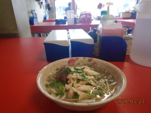 Thai Guest House スコタイ 時価 4泊目 2号室住所:25/4 Rachuthid Rd.,Sukhothai 電話:055 612853T 扇風機、ベープマット、机、20W蛍光灯、共同洋トイレ、水シャワー、洗面台今朝は目覚めが良かった。7時に朝食を食べに出かけた。モツ汁屋へ出かけたが休みだった。仕方がないので昨日と同じ店へ今日は豚バラ素揚げをスライスしてぶっ掛け飯108円を食べた。付け合わせにキュウリと少量パクチが載っている。甘餡かけが肉に掛かっている。飽きる味だ。タイ料理は甘い物が多い。宿へ帰るが、別にやることなし。動画編集なし。10時に自転車で出かけた。1万円を両替しようと思う。計算するとタイ通貨が不足するのだ。農業銀行へ行く、現金の両替はいつもここで行っている。スコタイには街の両替商はない。銀行が唯一の両替場所となっている。しかし出来ないと言われた。バンコック銀行へ行く、ここはATMを利用する銀行だ。ここでも両替はできないと言うのだ。警察が私をひっぱって、銀行の外へ。そこに張り紙が貼ってあった。コロナウイルスの影響で3月19日から両替中止と書いてあった。意味が理解できた。こうなると、余計にタイ通貨が必要となるのだ。もしもの事を考え、ATMで余分に引き出す事にした。ATMは普通に稼働していた。少額でも手数料が同じ792円かかってしまう。仕方がない。現金をゲットした。これでひとまず安心する。散髪をしようと思う。21日にスーパーに行く途中で見つけておいたのだ。その時にカットしておけばよかったのだ。今日は閉まっていた。次に見つけた床屋に張り紙が、やはり感染予防で政府が通達を出したのだ。諦めるしかない。スーパーで買い物をする。日本への土産物を買った。毎年品定めに迷う。今回は何にしようか?かさばらずに軽い物、香辛料セットにした。これを貰って実際に料理に使うとも思えないが、シナモンスティック、コショウ、八角などが入っている。見て楽しむ。スーパー内の食堂街は閉鎖されていた。テーブルが片付けられがらんとしている。客は殆どいなかった。卵の在庫が底をついていた。スーパーから1キロくらい新市街に向かった場所に、掘っ建て小屋の食堂がある。今日は営業している。調理担当のおばさんの姿も確認していた。5年くらい前までは毎日のように通った店だ。カナンムクローの美味しさを知ったのはこの店からだ。それが最近、素揚げ豚肉をおばさんは作らないので、カナンムクローが食べられないのだ。生豚肉で炒め物を調理するが、味が違うのでひとりでに足が遠のく。スコタイに来たら1回は顔をだしておきたいので食べる事にした。あれ!、今日は珍しく素揚げブタ肉があった。それを指さした。この店はいちいち注文しなくても料理が出てくるのがいい。5年ぶりのカナンムクローをこの店で食べた。味が濃い。値段も安い108円で肉の量は少ない。普通青菜と素揚げ豚肉だけだが、この店はキャベツが少量入っている。ショッパサが懐かしい味だった。今日もドリアンは売っていなかった。一旦宿へ帰りシャワーを浴びてリフレッシュする。15時オヤツの時間だ。徒歩で出かける。縫製材料店でファスナー2mを購入する。旅に使用するシーツ袋を作るのだ。今使用してる物がボロボロで限界にきている。捨てようと思うので、新しい物を作る時に使うのだ。1キロくらい歩き7イレブンでコーヒー90円とハスの実入りアンパン36円を買った。今日もベンチには先客がいた。20才くらいの女の子がスマホに熱中していた。その隣でコーヒーを味わった。今日はハッカの臭いに邪魔されずに味わえた。その足でメガネ屋へ。老眼鏡+3.5度が出来上がっているはずだ。出来栄えよいメガネを受け取った。小さな字を読むことができる。目はドンドンと悪くなってゆく、衰えて行くのだ。3月26日深夜のJALフライトを予約して安心していた。だが、いよいよ危機的状況となった。県境閉鎖だ。バスでバンコックへ行けるのだろうか?明日、移動開始しようと思う。先ずはバスでダメな時は飛行機か列車だ。今回の旅はツキがあるので楽観しているが。先にどんな落とし穴が待ち構えているかは分からない。悔いのない人生をおくりたい。