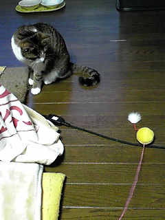 最近、もなかたんが大きくなった又は太ったって思いませんか?気がついたんですよ。寒くなってからと言うか、最近おもちゃであまり遊んであげてなくて、運動不足だったかもしれないんですよ。で、ちゃんと運動させてダイエットさせないとと言う事でもなかたんダイエット大作戦実行第一段ということでおもちゃで毎日最低10分以上は運動させようと目標を立てました。 にゃにゃ? 久々のおもちゃにゃ♪うきゃあ~~ 久々のおもちゃだったので途中「フンフン フンフン」言いながら大ハッスル久々の美しいハイジャンプもしてくれました。春暖かくなる前にスタイルを戻さないとね。あ。これはみあーたママにも言えることだねもなかたん、ママと一緒に頑張ろうね