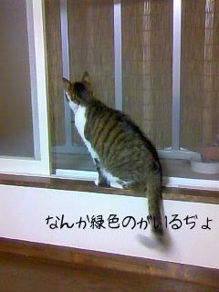 今日のもなか9月5日暑さがぶり返したみあーた地方。窓を全開にいて電気をこうこうと点けているともなかたん、網戸の外、簾に何か見つけたようです。ハンパない反応です。そいつが動くたびにもなかたんも一緒になって動きます。そいつは緑色のこいつ。 バッタ君です。このバッタ君を追いかけて網戸に爪を立てるもなかたん。4キロ超の巨体が網戸に張り付く恐ろしい想像をしましたが大丈夫でしたこんな風に網戸でいられるのもあと少し。朝晩は半袖だと寒いくらいです。その頃にはきっとこのバッタ君も姿を消すんでしょうねぇ~~(シミジミ)