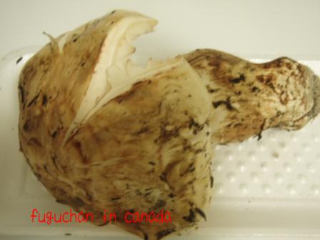 気がついたら10月に入ってました。バンクーバーはすっかり。。。。秋を通り越して、朝は冬の寒さです。我が家の食卓はほとんどが和風ベジタリアンなのですが、日本食店に行って、日本の食品を買うことはあんまりありません。3ヶ月に1度くらい行くかどうかって感じです。オーガニックの豆腐や、味噌や、大根などの野菜も、普通のオーガニックのお店で買えるので、わざわざ日本食店に行く必要がないからです。(逆に日本食店は、日本からの輸入なので、フードマイレージも高いし、オーガニックは少ないし、なんと言っても高い!)しかし、今回はバンクーバーで有名なFujiyaさんに行ってきました。何でかって?カナダ産 マツタケが販売されたのを聞いたからです。行ってみると、おお~~~、たくさん並んでる!!!けど、た、高い。。。1キロ65ドルの値段で販売されておりました。日本に比べると安いのでしょうが。。庶民の私には、そんなのは買えません。だから、傘が開いているのを買って、これ7ドルでした(600円くらい?)直径20cmくらいありました。かなり大きかったです。傘が開いてても、においはぷーんと良い香り!!!!!私は別にマツタケが好きってわけでもないのですが、四季ごとの旬な物を食べたい!と思うようになり、マツタケは毎年買うようになりました。マツタケご飯、玄米で炊きましたが、むちゃくちゃ美味しくって、その夜、桃太郎と二人で3合、全部食べてしまいました。。。はははは。。。カナダで取れるマツタケは、ほとんどが日本へ輸出されるそうですよ。カナダ産マツタケありました!!!こちらもアメリカ、カナダ産やっぱり日本では中国産が多いですね。。。私が知ってる限り、カナダで取れたマツタケは、養殖ではありません。