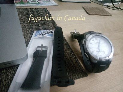 この日。。。。注文していた、時計のバンドが届きました。NYのどこからの取り寄せだったんだけど、注文したの、なんと約3週間前!!!!カナダポストのストライキと重なり。。。。。1週間で到着する予定だったのに。。。。私が使っているカシオのタフソーラー。それも、購入したのがかれこれ、14年前くらいで、未だに一度も、電池を変えたことがない、当たり前か、ソーラーパワーだもんな(´-∀-`;)その前は、カシオのGショックなんてのを使ってたのですが、なんか、腕が重たく感じて。。。タフソーラー、それも電波時計を買いました。世界中どこへ行っても、自動的に時差を調整してくれます。おまけに、ダイバーでも使える気圧バーが付いてるので、海へ問題なしに潜れたし、防水だし、私みたいに、なんちゃってアウトドア派には、ぴったりの時計です。しかし、先月、いきなりゴム製のバンドが、ポロっと取れて、えええええ???で時計屋さんに行ってみると、いやー、もうこんな古い時計は、同じバンドはないね。。って言われ。。そうだよね、14年前。。。が、ネットで、正規のバンドを見つけて、マジ~???でオーダーしました。私が自営業を始めた12年前から、ずっとそうなのですが、我が家は、目覚まし時計を使っておきません。腹時計がちゃっかり動いてるんですよね。。。勝手に目が覚めるので、寝ぼけて2度寝ってのは、殆どない。だから、私はデイライトセービングが大嫌い。あれで、思いきり、時差ぼけになる。仕事でやっぱり時計は必要です。セッション1時間、90分とか決めてすると、携帯で、タイマーにでもすればいいんですけど、大体、みんなワンコとか寝てしまうし、タイマーだと起こしてしまいます。さて、バンドがきたものの。。。取り外し方がよくわからず、(;^ω^)結局、桃太郎に、取り付けしてもらいました。桃太郎は、こういうのがとても器用で助かる。私は死ぬまでこの時計を使いたいと希望してるんですけど、だったら、もう一個余分にバンド買っておけばよかったな。。。と、後で後悔。。。CASIO G-SHOCK カシオ ジーショック(GA-1100-1A3JF)(BLACK GREEN)(SKY COCKPIT スカイコックピット) 即納商品 国内正規品 腕時計 メンズ 男性用 時計 ウォッチ タフソーラー 防水 方位計測 耐衝撃 耐遠心 対振動機能 Gショック GSHOCKカシオ 10気圧防水タフソーラーウォッチ W-S220C-7BJF【店頭受取対応商品】[7年保証] [カシオ]CASIO エディフィス EDIFICE 電波 ソーラー 電波時計 腕時計 メンズ タフソーラー クロノグラフ EQW-T650DB-2AJF [4549526170522-EQW-T650DB-2AJF]