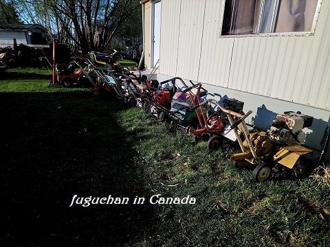 気が付いたらもう5月末に近づいてきてますね。。我が家の桃太郎。。。。お父さんのお葬式も先月済んだのに。。。。まだエドモントン。。。周りのみんなから、え?まだ帰ってきてないの?何やってるの?と、聞かれるんですけど。。。こっちも知りたいわ!と思ってたし、もしかして、お父さんの遺産をもらって仕事をする気がないのか!? なんて、勝手に妄想し始めた私がいたし。。。苦笑仕事を休んでるから、その関係で、私が用事を頼まれることも多くなり、桃太郎の事で色々振り回されるし。。。疲れてきた、私も。で、直接本人に聞いてみた。仕事は戻る気があるのか? いつ帰ってくるのか?と。。。そしたら、当たり前や!!!仕事も戻るわ!とこっちも戻りたいけど、こんなんで戻れるわけがない!と怒られた。理由はこれ。。。↓な、なんと50台もある、芝刈り機。。。。私はこれを15台だと聞き間違えて。。。(今更、フィフティーンと、フィフティを聞き間違えるとは)なんで、そんなに時間がかかるのか、わかってませんでした。。。お父さん、メカニックで、ガンになるギリギリ去年の12月まで、リペアマントして働いてたのですわ。お父さんのガレージもこんなの。。。↓物がいっぱいで、整理して、これなんですわ。。。。(´-∀-`;)しかし、もうすでに4か月ほど、エドモントンにいるわけで。。。始めから、こんなに量があるってわかってたなら。。。早く処分できたはず。。。。と、私は思ってたんだけど。。。よく考えたら。。。。。1月から4月まで、エドモントン、雪積もってましたから。。。(;^ω^)これは去年の9月の写真。。。。で、この冬は体感温度マイナス40度、実際気温マイナス35度だったので。。。そりゃ、ガレージセールできませんわな。。。(^▽^;)今では50台あったのが、25台くらいになったそうな。。。それでも、毎週、EstateGarageSale (遺品ガレージセール)をやってて。。。忙しい毎日を送っており。。。お父さんの土地は、今年は売らず。。。妹がここに住むらしく。。。それの名義の書き換えとか、弁護士とか、銀行とか、なんだか終わらないことがいっぱい。。。長男って、大変だわ。。。というよりも。。。 お父さんの遺品を見て。。。ますます、私は断捨離生活に励むのでした。。。私の独身生活はまだまだ続くのですわ。。。とほほ。。。