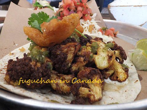 で、タコスですが。。。べジタコスを食べました。これ、一つ、$5.50ドル。