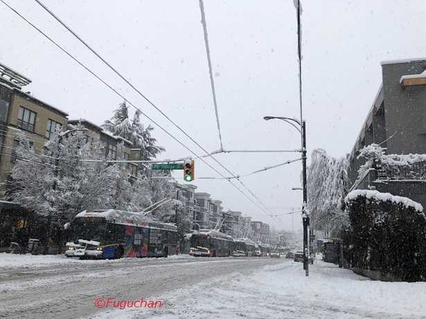 この通り。。。。雪が降ると、電気で走るバスはダメなんだって!