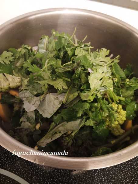 レタス、紫蘇、パクチー、ケールと、野菜たっぷり入ってて、