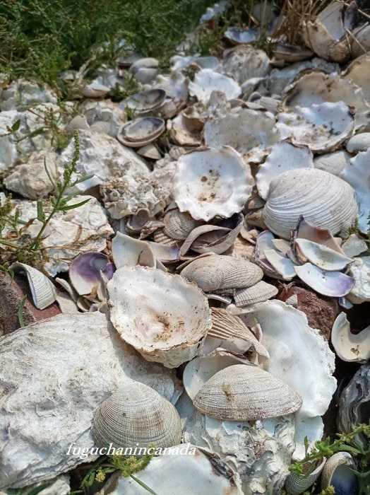 見て、この貝殻の山!!!牡蠣に、アサリ、ハマグリに、色々な貝殻がいっぱい落ちてて!!