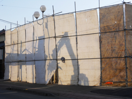 足場シートの奥に、大きな動物が現れましたよ毎朝8時ちょうどから大きな鳴き声をあげ、獲物を食っています西日が当たり、ついに正体が見えましたね一瞬動物園でした~