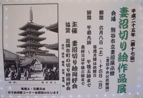 妻沼切り絵同好会では、作品展を開催中!6月16日(日)まで、場所は、熊谷市妻沼、中央公民館(展示館)9時~5時・最終日は3時までですもちろん、妻沼聖天山をテーマにした作品も有りますので、参拝のお帰りにはぜひ、お立ち寄りください。無料で見られます木造、瓦屋根をテーマにした作品は、見所がありますが、最近の傾向は、人物を入れ込んだ構図が多く見られます。切り絵で人物や動物を表現するには、無理があると思っていましたが、今回の作品展ではウオ~ォ・・・やられました、素晴らしい表現方法に見入ってしまいましたよ土、日は、切り絵の体験教室を開催しています。