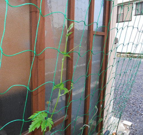 グリーンカーテンの網目は、縦10センチ、横8センチあります朝顔、ゴーヤ、フウセンカズラ、スタートダッシュが早いのはゴーヤ君でした前日の写真と比べたら、なんとびっくり網目1段ほど伸びていますよ。10センチすごい成長力と言うか、生命力に・拍手摘心とかするの???こちらのヒゲもクルリン・くるりん