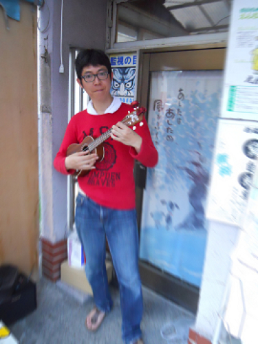 どこからか???聞き覚えのある音色が聞こえてきましたヽ(・∀・)ノ知る人ぞ知る、あの有名なMasaさんでしたよ隣の、たこ焼き屋店頭でウクレレの演奏をしていました(^O^)午後4時ころ、まだまだ猛暑日の続く当地ですが、暑い日には、熱い食べ物がうまい!ということか?商店街で行列ができるのは、ここと、いなり寿司と、かき氷くらいですね。Masaさん只今失業中なので、趣味の、折紙、ウクレレ、オルゴールの腕を磨いているようです(笑)待ち時間のあるお客様へのサービスを兼ねて、腕試しを・・・・してるかもね?手づくり市でもウクレレの流しをやったり、イベントにも出演していますので、出張演奏など有りかもよヽ(*´∀`)ノ サービス万点の名人です。よろしく ヽ(´▽`)/