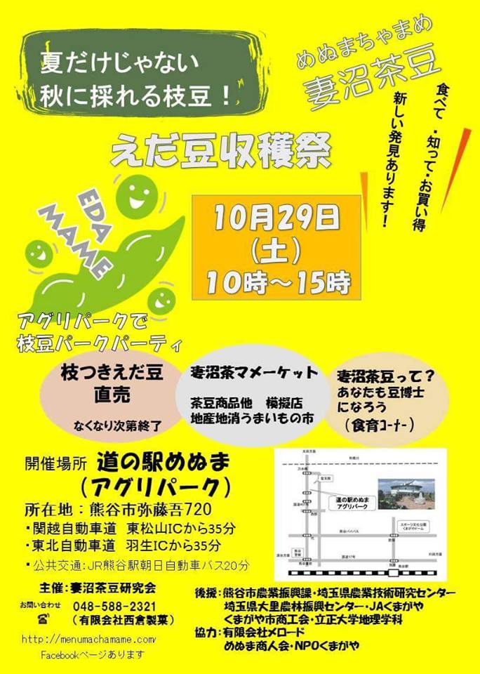 10月29日(土)は、妻沼茶豆の収穫祭ですよ(^^)/「道の駅めぬま」で収穫したばかりの枝豆の販売や関連商品が盛りだくさん(^_-)-☆主催・妻沼茶豆研究会http://menumachamame.com/story/story.htmlhttp://tkt48.net/blog/?p=2713当店では、妻沼茶豆から豆乳を作り、ご提供していますよ(^^♪フレッシュ野菜ジュースにMIXしても良いし、甘酒とのMIXももちろん、そのままでもおいしく飲めます。自宅では、おからを料理していただいてます(^_-)-☆