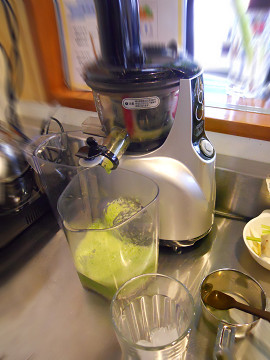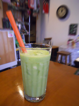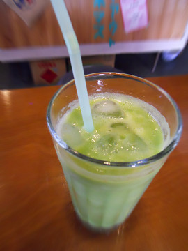 妻沼産の「大和いも」を使った新メニューできましたよ(^^♪当然(^_-)-☆フレッシュ野菜ジュースで~す毎日試作試飲を繰り返し・・・本日が一番の出来上がりだ~(^◇^)それでは乾杯~(^^)/大和いもは滋養強壮に効く健康食品胃腸の調子を整えますよ(^^)/山芋よりも粘りが強いので最初は「とろろ」のようなネバネバドリンクを想像していましたが・・・ネバーギブアップ!( `ー´)ノあの手、この手、猫の手も借りて試行錯誤を繰り返し・・・スロージューサーでは限界を感じたので(-_-;)ミルサーで材料をすべて混ぜ合わせてみましたつまりこのメニューは、ジュースではなくスムージーになります。大和いも、ケール、リンゴ、大根、隠し味にレモン、塩、そしてワサビ(^_-)-☆ストローで飲めるようになりましたよ改善点が1個ありました(^◇^)もう少し太いストローがあれば、よりスムーズに飲めま~すお近くにお越しの際はお試しあれ(^_-)-☆「大和いも魂スムージー」480円也