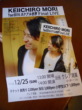 妻沼出身シンガーソングライター、森圭一郎さんのライブチケット発売開始(^_-)-☆今回のファイナルライブの会場は、埼玉県鴻巣市「クレア鴻巣・小ホール」プラスアルファーのクリスマスとなりそうですよ(^^♪今回のチケットは特別仕様(^^)/ポストカードになっているので、予約すると郵送でこの笑顔が届きますよ(^O^)熊谷市妻沼地域の方は当店で取り扱っていますので、お早めにどうぞ~前売り2,500円直接購入される方は藤川屋青春館まで(妻沼仲町バス停前・熊谷市妻沼1429)電話・048-588-5050待ってま~す(^_-)-☆