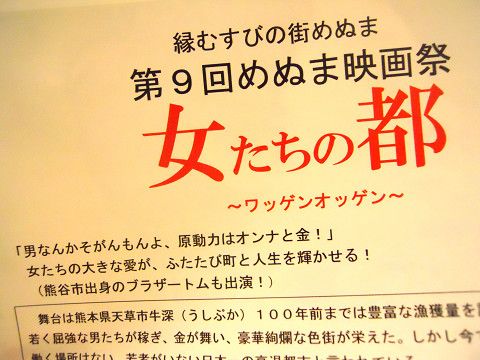 皆さまお待たせいたしました(^^)/第9回めぬま映画祭の内容が決定いたしました(^^)/後日、ポスターやチラシを持って応援の依頼にお伺いいたしますので、その時はよろしくお願いいたします。(^_-)-☆日時:平成29年1月29日(日)午後1時開場・1時半開会場所:熊谷市妻沼中央公民館大ホール内容:第1部・・・キッズダンスRing2(ダンスの披露) 第2部・・・映画上映「女たちの都」詳しい内容は後日掲載いたしますので、お楽しみに(^_-)-☆この映画の舞台は熊本県天草市牛深(うしぶか)ということなので(^^♪今回の映画祭では、熊本地震の復興を支援する募金活動を行います。ご協力をお願いいたします。また、収益の一部も義援金として送ります。主演:大竹しのぶ旦那さん役で、熊谷市出身のブラザートムさんが出ていますよ。元気をもらえる映画ですので、ぜひご来場ください。前売ペア券1,000円前売券・600円、当日券800円中学生以下無料発売は11月下旬より(藤川屋青春館、さわた妻沼店、大福茶屋、騎崎屋)