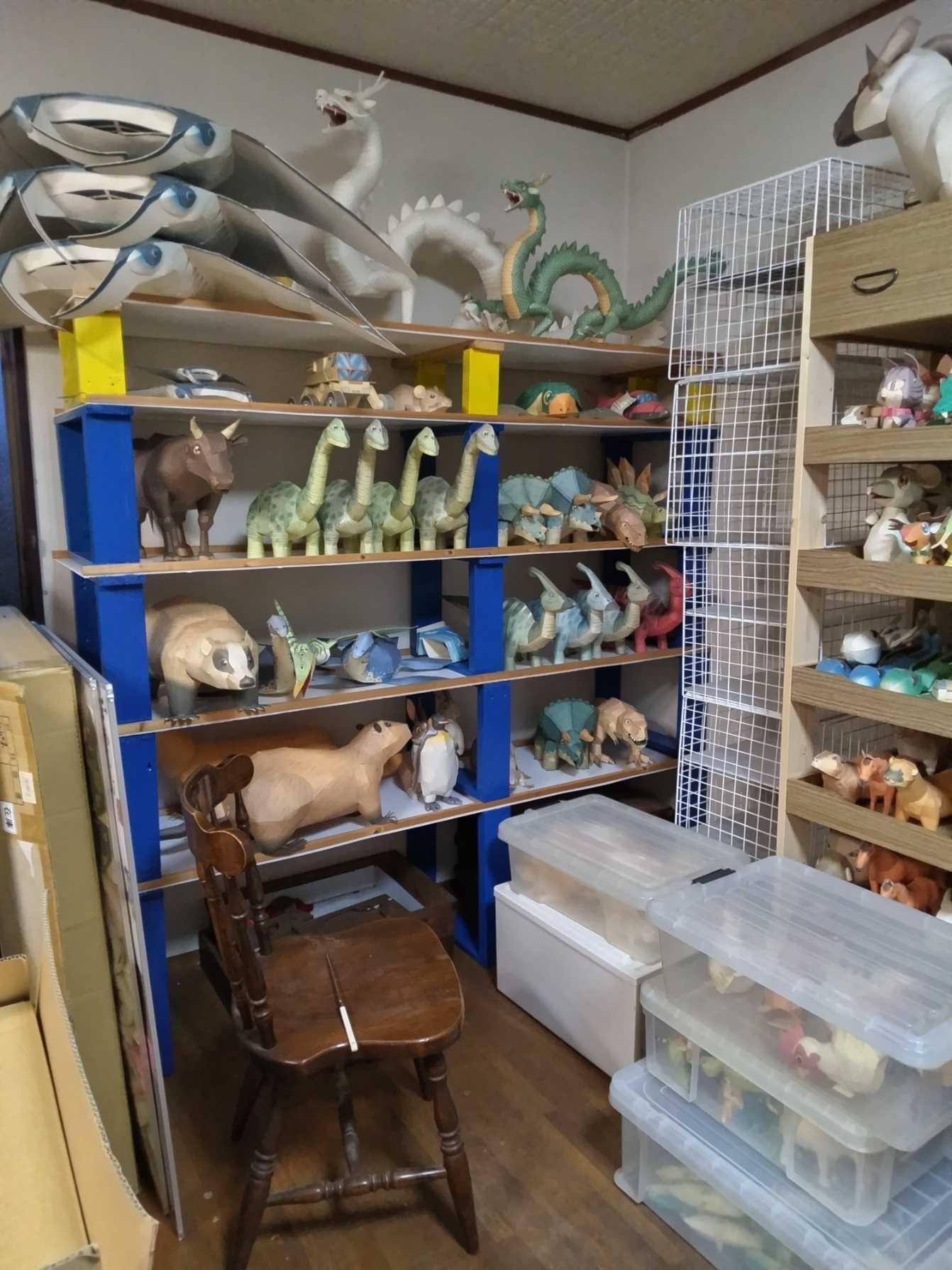 家で一服してから倉庫へ。家の二階でペパクラの整理。箱から出して棚に収納していく。展示用の大きなやつは、家の1階の部屋からプレハブの棚へ。ゴム系接着剤で組み立てた初期のものは、変色しているので順次廃棄。修理の必要なものは作業部屋へ。