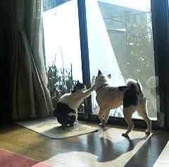 今日は水曜日。お仕事の日でした。夕方まで仕事をしてロールケーキを買って帰宅。旦那のお誕生日だから、好きなケーキを食べてもらおうと何処のがいい?って聞いたの。旦那のリクエストは、パステルの「なめらかプリンロール」だったんだけど、これは限定品なので銀座三越に行かないと買えない・・・しかも一日15本だって(汗)今日は仕事だったから買いに行けないので諦めてもらう事に・・・。デパ地下をうろうろして悩み、ヨックモックの「ふんわりロールケーキ・キャラメルプリン」にしました。こちらもロールケーキの中にプリンが入っているの。美味しかったです^^食べる前に写真を撮ろうと思ってたのに忘れちゃったぁ。なので今夜の写真は先日撮ったROCOとハッピーの写真です。ROCOがハッピーにまとわりついて、ハッピーが怒ってROCOに猫パンチをしてる写真です^^;