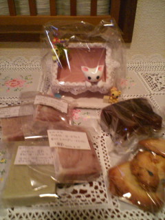しばらく日記サボっちゃったなぁ。なんせ体調が悪くてまいった。。。26日の水曜日は朝早くからお仕事でした。どうせ今日も入力少ないだろうなぁって思って、早く終わるのを見越して妹とお昼に待ち合わせをしていたの。でも帰る間際に入力を頼まれたりでバタバタしちゃった。妹が有給休暇でお休みを取ったって言うので海老名まで来てもらってしばし妹と行動。ホントは町田で会おうかと思っていたんだけど、風邪で身体が辛いのと友人のお父様が亡くなったので早めに帰宅した方がいいかなって思って海老名で。ほんの4時間弱だったけど、ランチしてお買い物してお茶して妹と楽しいひとときでした。帰宅したら、やっぱ身体が辛かった・・・。27日、木曜は朝起きた時からもうダウン寸前。何とかお弁当は作って、旦那が出勤したらまたマイルームで寝たよ。でも銀行に行かなきゃいけなくて、どうしよう・・・って思っていたらお隣のY江ちゃんがお買い物に行くっていうので乗せて行ってもらいました。銀行は遠いのでコンビニのATMで用事をすませ、スーパーにも寄ってもらって助かった。ほんの少しのお出掛けだったのに帰宅したらもうヘロヘロでした。午後も寝たり起きたりの繰り返し。友人のお父様のお通夜に行かなきゃで夜までには少しは元気になっていないとって思って横になっていた所にお電話が・・・。急遽、お通夜の受付をする事に・・・。旦那様の帰宅を待ってられないので、義理母に送ってもらって先に斎場へ行ったよ。受付で気がはっている時はシャンとしてたけど帰宅してドーーッと疲れが。昨夜も私は風邪がひどいのでマイルームで一人で寝たよ。今日は昨日よりかは身体ラクだったけど、旦那様が7時までに会社に行かなきゃいけないって言うので、今日はお弁当作りはしませんでした。でもゆっくりは寝てられない・・・。今日の告別式の受付も頼まれていたので、私は斎場へ。受付の仕事も終わって最後のお見送りまでさせて頂いたんだけど、お見送り辛かった。泣いてしまいました。以前お家に遊びに行った時のお父様の姿を思いだしてしまってね・・・。お別れって辛いですね。そしてさっきお昼前に家に帰宅しました。昨日に比べると身体はだいぶラクだけど、咳がひどくなってきたかな。まだ喉も痛いしね。熱が下がったから身体はだいぶラクなのかなぁ。お天気がよくてお家にいるのはもったいないけど、今日は我慢してお家で静養しています。数日前にあみちゃんショップで購入したお品が届きました^^おまけまで頂いちゃって申し訳ない・・・。あみちゃんありがとう♪クッキー美味しかったよぉ。
