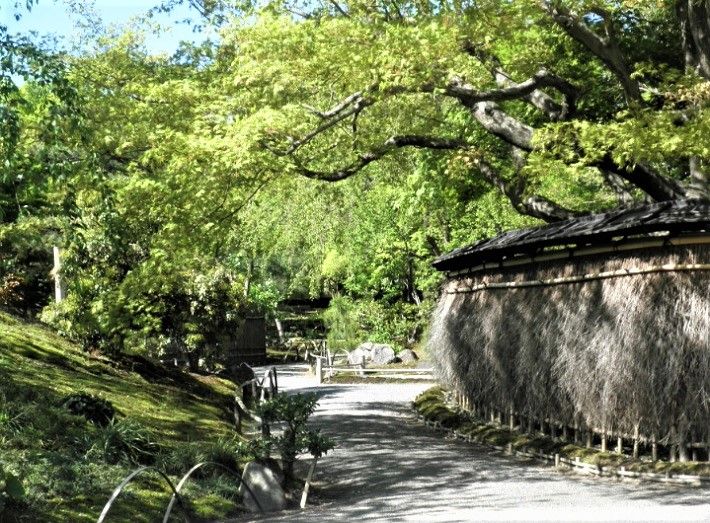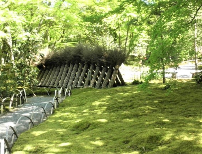 ↓「豊丸垣(ホウガンガキ)」と呼ばれ、竹の小枝を下向きに重ねた垣で上部に屋根が設えてあり庭の風情を高めます 右には青苔が育ちます