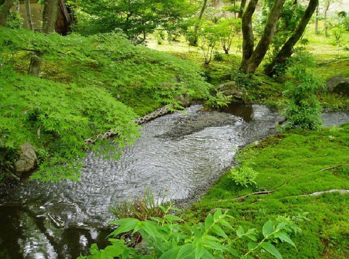 ↓大堰川から曵かれた水が庭内を流れます もみじが水辺に生き生きと育ちます
