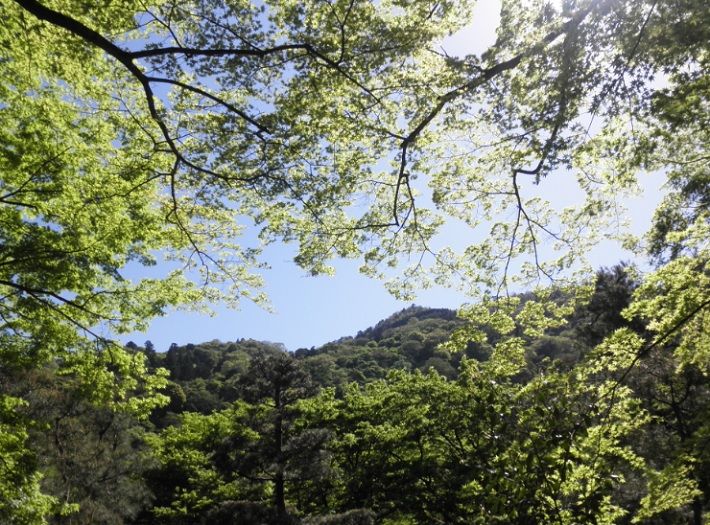 ↓青もみじの先は借景嵐山です (もみじ撮りたいが為に嵐山が小さくなりすぎです)