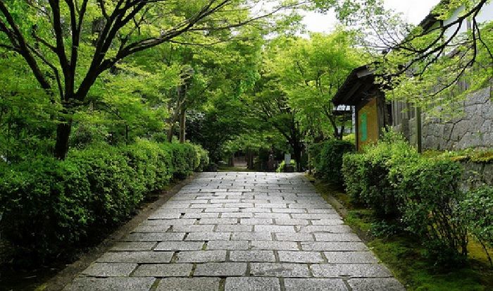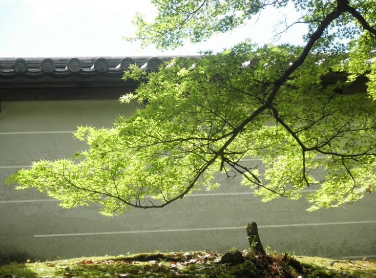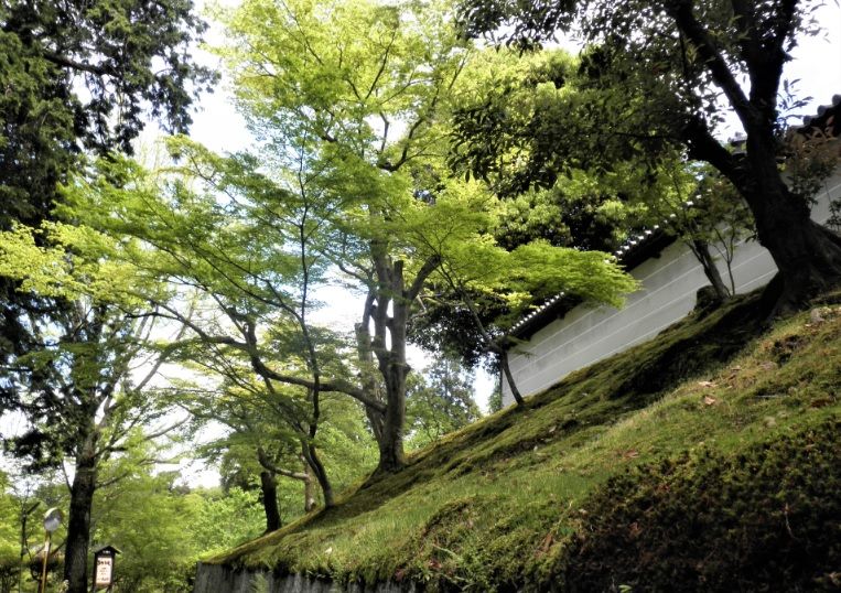その勅使門から参道へアーチのように高く囲う青もみじに癒されます 右斜面は先にゆき苔に替ります