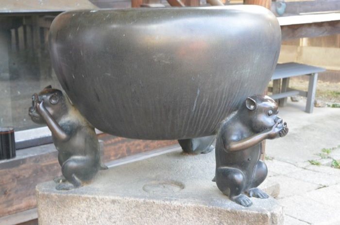 ↓本堂前の香炉、これも三猿が支えています