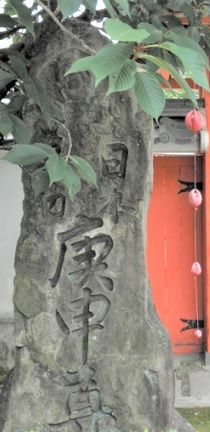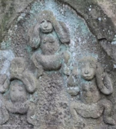 ↓山門前の日本で最初の「庚申塔」石塔で上は葉に隠れていますが、右側の三猿が彫られています