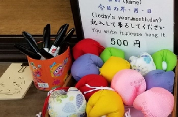 ↓色とりどりの手作りのくくり猿、寺務所で求められます 願い事を書き願掛け所に奉納します