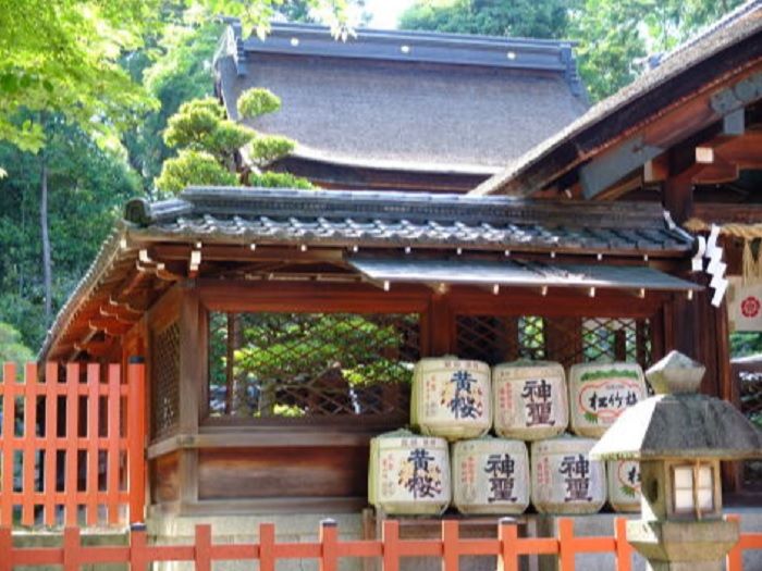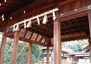 ↓「本殿」正面から 神門の切妻造檜皮葺の屋根は緩やかに丸みを持ち穏やかな表情をもつ門です