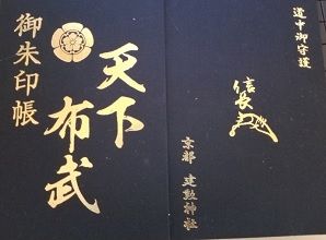 ↓神社見開きの御朱印帳表・裏のみで、ブログでお知り合いの悠愛さんにはお叱りをうけると思いますが御朱印書いて貰らわずです (右)は信長着用の鎧「紺糸縅(オドシ)胴丸鎧」です  (両方の写真は神社紹介Pより)